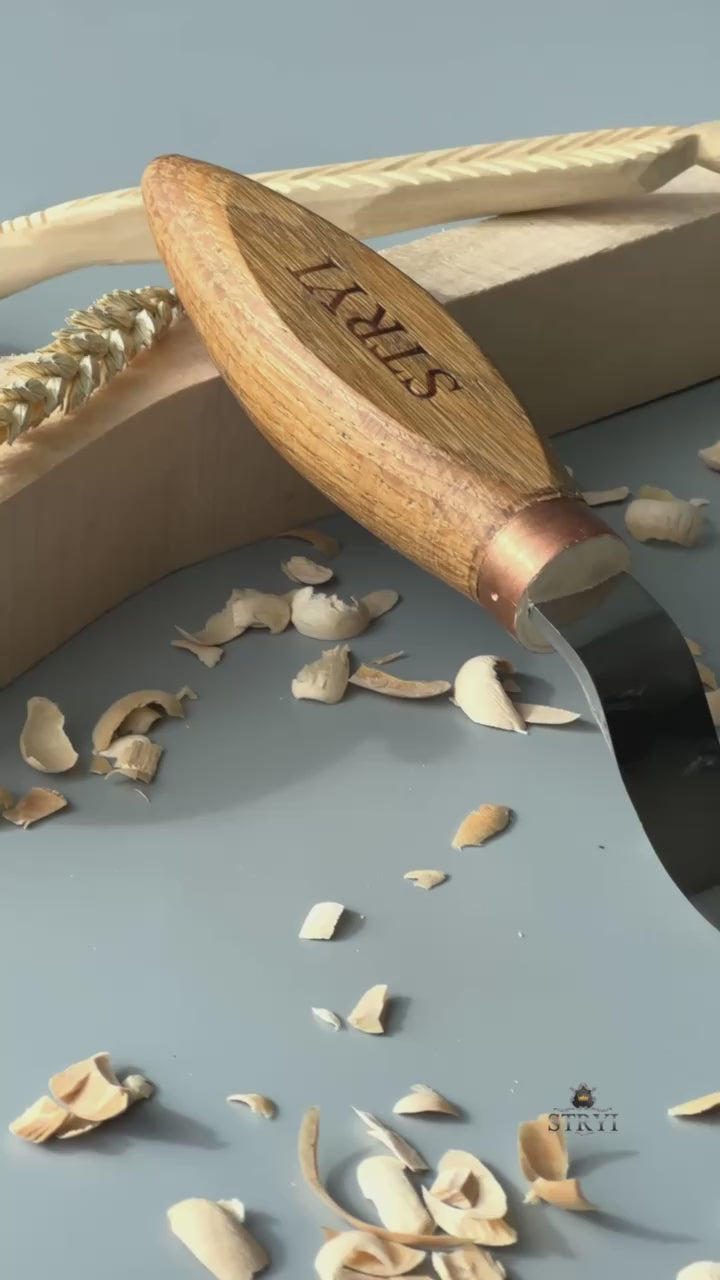 Spoon Bowl Kuksa carving hook knife 50mm STRYI Profi, art. 150050 (right-handed) and art. 150051(left-handed) is designed for making sloping deepness in spoons, spatulas, and ladles.